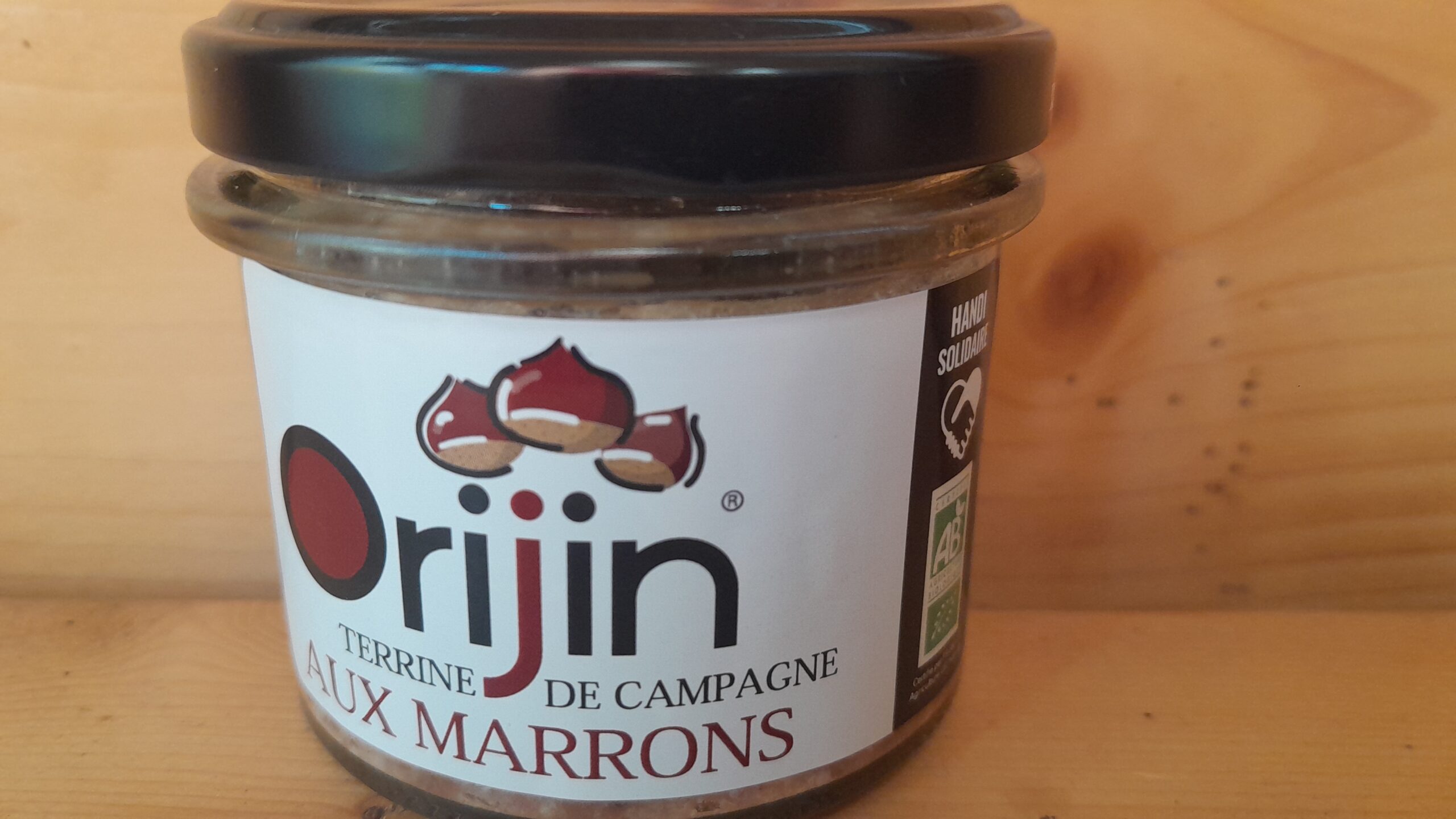 Viande Porcs bio de l’ouest de la France : gorge de porc 49% , foie de porc 15%, couenne 10% viande de porc 7%, marrons 7%, gras de porc, oignons,ail, persil, thym…